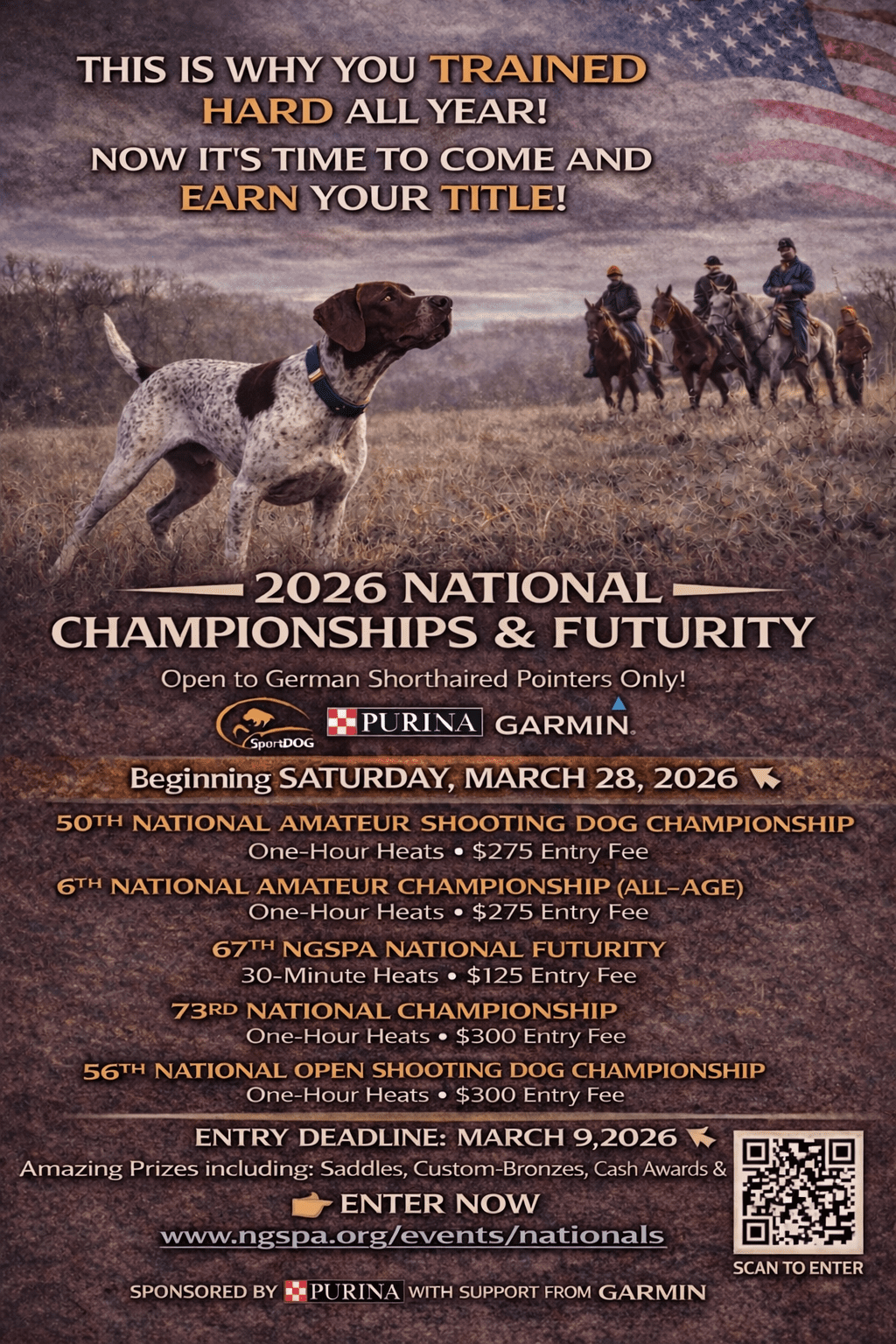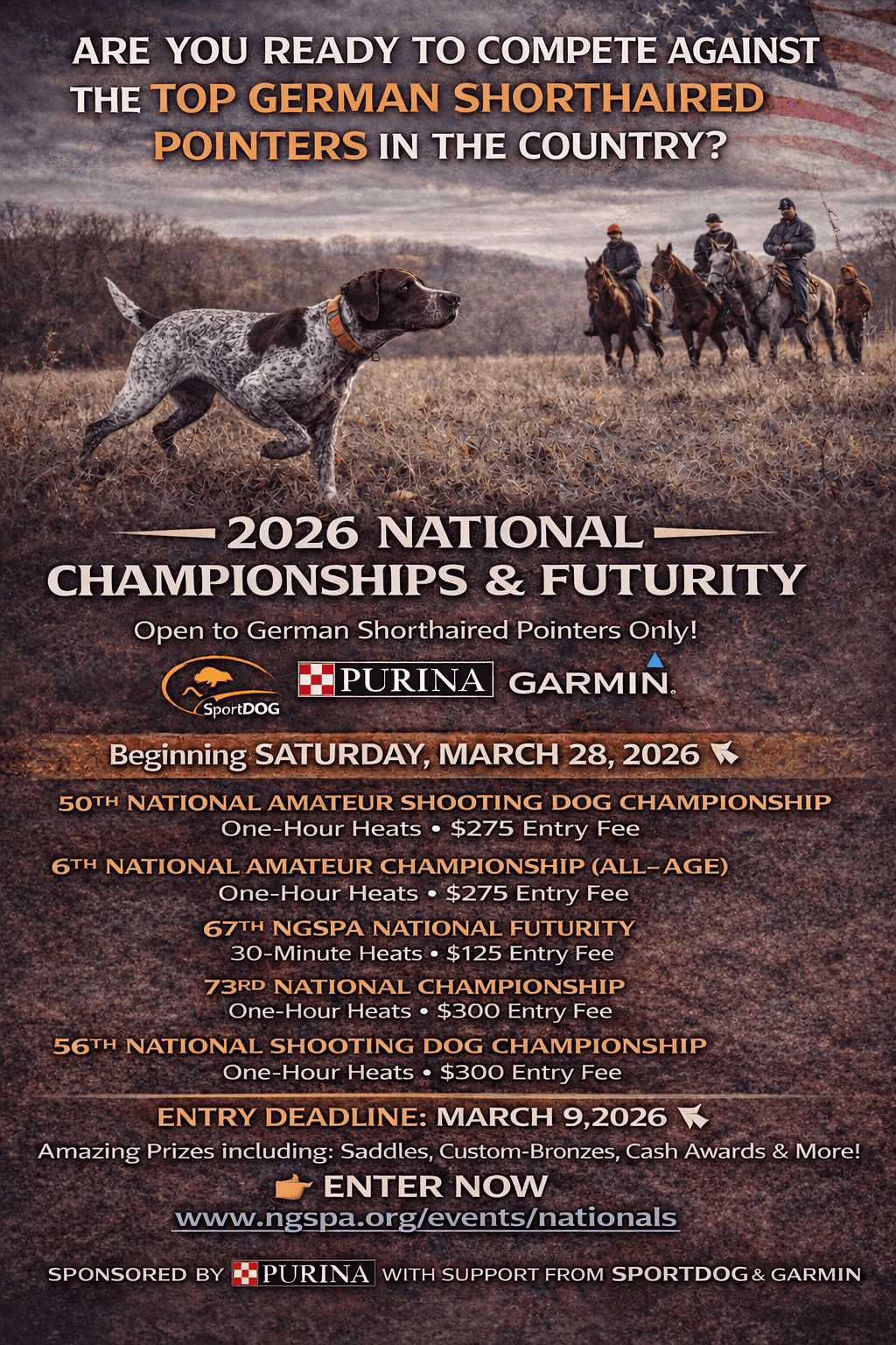 The National Futurity, sponsored by the NGSPA, promotes the development of national-caliber All-Age Dogs and Shooting Dogs and provides breeders, exhibitors, and spectators with an opportunity to compare and evaluate their breeding results to those of other breeders.